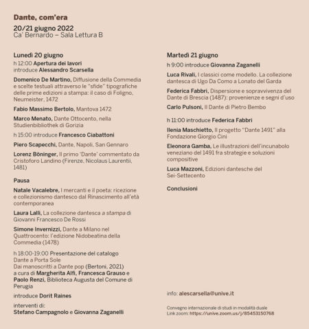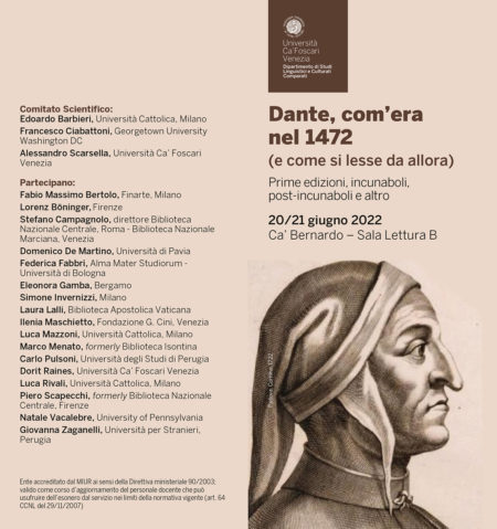 Biblion edizioni invita al convegno “Dante, com’era nel 1472 (e come si lesse da allora)”, che si terrà lunedì 20 e martedì 21 giugno presso la Sala Lettura di B di Ca’ Bernardo, Venezia. Qui sotto il programma dell’evento.