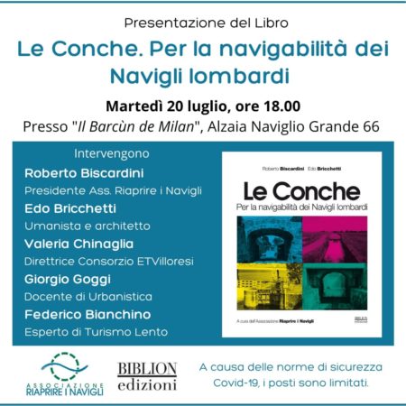 Biblion edizioni invita alla presentazione del volume Le Conche. Per la navigabilità dei Navigli lombardi, di Roberto Biscardini e Edo Bricchetti. L’incontro si svolgerà in presenza martedì 20 luglio alle ore 18.00 presso il “Il Barcùn de Milan”, Alzaia Naviglio Grande 66 (fino a esaurimento posti). Qui sotto la locandina dell’evento.