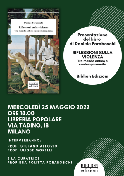 Biblion edizioni invita alla presentazione del volume di Daniele Foraboschi, Riflessioni sulla violenza. Tra mondo antico e contemporaneità, a cura di Politta Foraboschi, che si svolgerà mercoledì 25 maggio alle ore 18:00 presso la Libreria popolare di via Tadino 18, Milano. Qui sotto la locandina dell’evento.